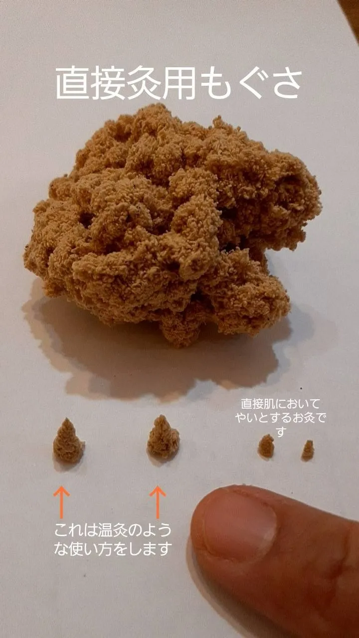 又は、昔ながらの「やいと⋯直接肌に艾(もぐさ)を置いてツボに直接お灸をすること」をやってみたいという方は薬局で「艾(もぐさ)」を購入していただき自分で「艾(もぐさ)」を形(艾柱)作っていただきお灸をすることもできます(やいとは火傷がつきものですのでお近くの鍼灸院でツボをみてもらってください。)